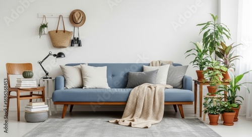Fototapeta premium Serene Living Room with Blue Sofa, Plants, and Natural Light Accents