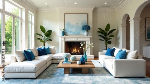 © Bh_19, Fototapeta premium Serene Living Room with Sectional Sofa, Fireplace, and Blue Accents