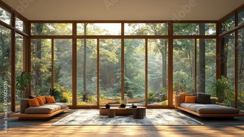 Obraz premium Serene living room with wooden frame windows overlooking a lush forest. Ideal...