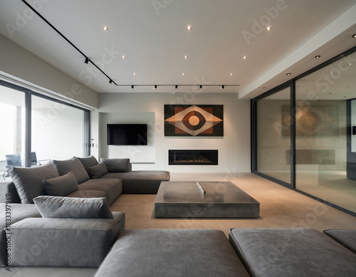 Naklejka premium Serene living space A modern interior featuring a plush sectional sofa, sleek fireplace, abstract art. Ideal for architecture, design, lifestyle concepts.