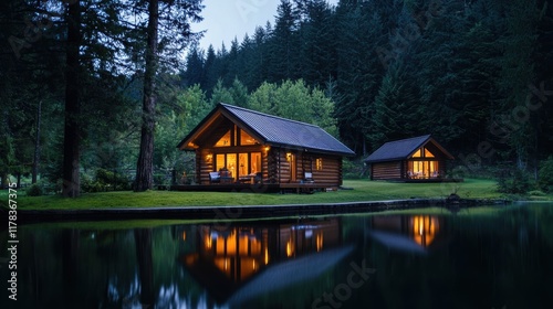 © FoxGrafy, Fototapeta premium Serene log cabins by a tranquil lake at dusk