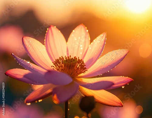 © Simon, Fototapeta premium Serene lotus blossom at sunrise with dewdrops and warm glow