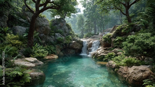 Fototapeta premium Serene lush green forest landscape with flowing waterfall cascading into...