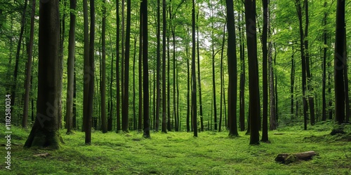 © Atmospheric stock, Obraz premium Serene lush green forest with tall trees and sunlight