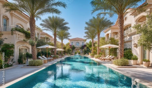 Fototapeta premium Serene Luxury Oasis Poolside with Palm Trees and Elegant Villas