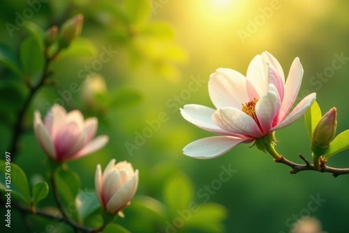 © Mali, Obraz premium Serene Magnolia Blossoms Bathed in Golden Sunlight, a Gentle Spring Breeze Rustling Through Lush Green Foliage