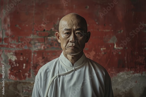 Naklejka premium Serene mature monk in traditional white clothing stands against a textured red wall