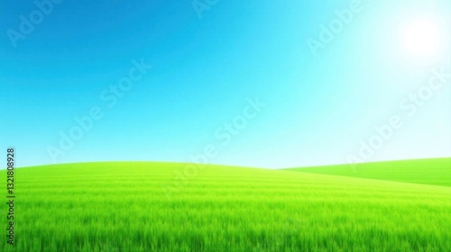 © vattana, Obraz premium Serene Meadow Landscape Vibrant Green Grass Under a Clear Blue Sky with Gentle Rolling Hills and Bright Sunlight