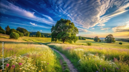 Obraz premium Serene Meadow Path at Sunset with Blooming Wildflowers and a Majestic Tree