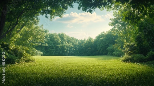 Obraz premium Serene meadow surrounded by majestic oak trees nature scene tranquil environment wide angle view