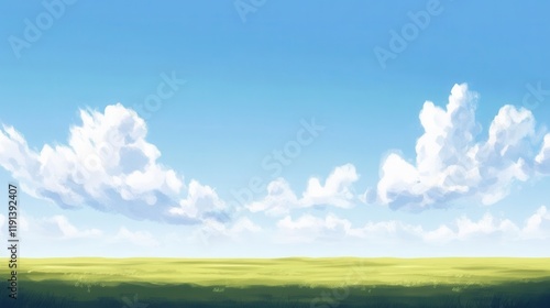 Fototapeta premium Serene Meadow Under a Bright Blue Sky With Puffy Clouds