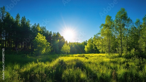 Obraz premium Serene Meadow with Trees and Bright Sunlight