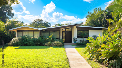 Fototapeta premium serene Mid Century Modern house surrounded by lush greenery and vibrant...