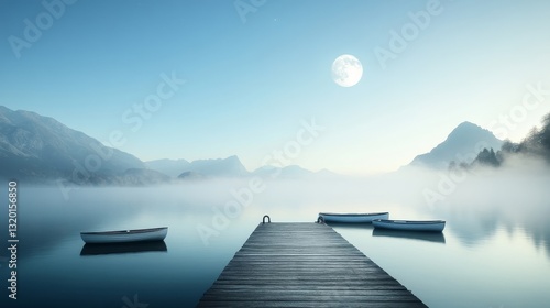 © อาริษา วันดี, Obraz premium Serene Midnight Scene with Boats on Calm Water and Full Moon
