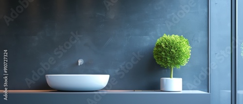 Fototapeta premium Serene Minimalist Bathroom with White Sink and Plant, High Resolution Elegance