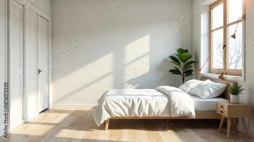 Obraz premium Serene Minimalist Bedroom with Sunlight Streaming Through Window and Light Wood Floor