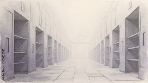 Obraz premium Serene Minimalist Hallway: Empty Shelving Units in a Foggy, Architectural Drawing.