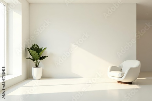 © napak, Fototapeta premium Serene Minimalist Interior Design Sunlight Illuminates a Modern White Room with a Comfortable Chair and Lush Greenery