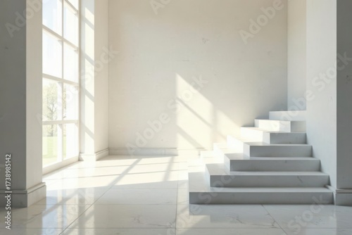 Fototapeta premium Serene Minimalist Interior Sunlight Illuminates White Staircase and Gleaming...