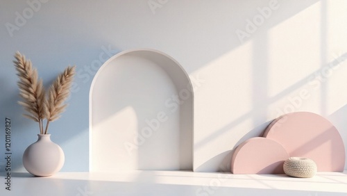 © DeeDay, Fototapeta premium Serene Minimalist Interior with Arch Niche, Pampas Grass, and Pastel Pink Display Platforms