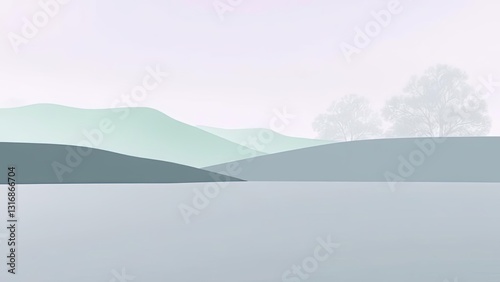 Fototapeta premium Serene Minimalist Landscape Misty Mountains Trees Calm Water