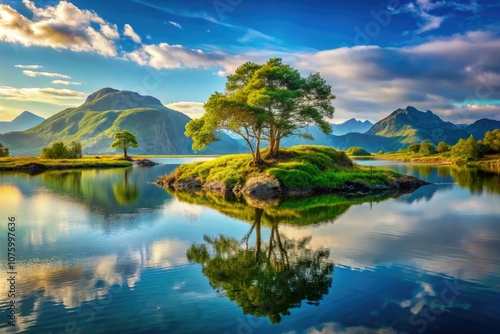 © nick, Obraz premium Serene Minimalist Pond on an Island Surrounded by Hills and Seashores - Tranquil Nature Escape