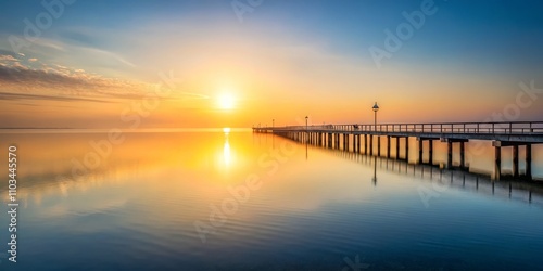 Naklejka premium Serene Minimalist Sunrise Over a Fishing Pier with Gentle Waves and Soft...