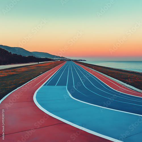 Naklejka premium Serene Minimalistic Landscape Featuring a Track Path by the Sea at Sunrise, Capturing the Tranquility of an Early Morning Sports Environment