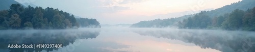 © methinee, Fototapeta premium Serene mist rises slowly over the calm lake surface, stillness, calming