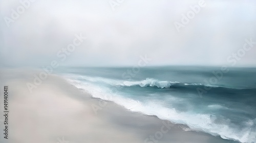 © thenort, Fototapeta premium Serene misty beach scene with gentle waves lapping the shore.