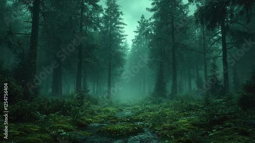 Fototapeta premium Serene misty forest landscape with lush greenery and a tranquil stream...