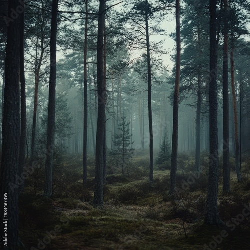 © Damerfie, Obraz premium Serene Misty Forest Landscape with Tall Pines