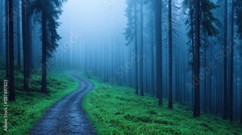 © AtomMaya, Fototapeta premium Serene Misty Forest Path Through Tall Evergreen Trees at Dusk