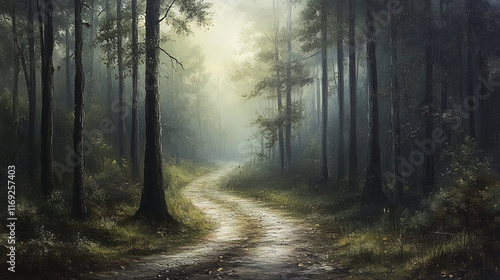 Fototapeta premium serene misty forest path winding through tall trees creates tranquil atmosphere