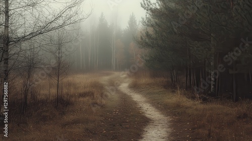 © nabila, Naklejka premium Serene Misty Forest Pathway with Lush Green Trees and Foliage