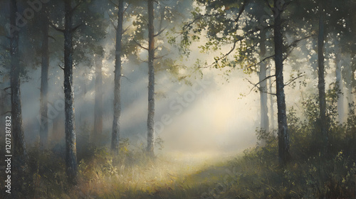 © Kanika Graphic, Obraz premium Serene Misty Forest with Sunlight Filtering Through Trees