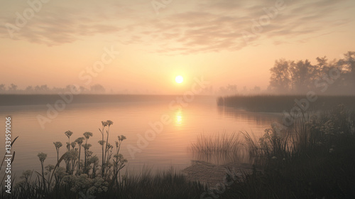 Fototapeta premium Serene misty lake at sunrise with the sun barely visible, enveloping nature...