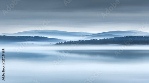 Fototapeta premium Serene misty lake landscape with rolling hills and a tranquil forest shrouded...