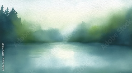 Fototapeta premium Serene Misty Lake Landscape with Soft Greenery and Calm Waters