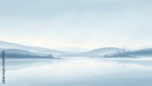 © Ahingska, Obraz premium Serene Misty Lake Mountain Landscape Peaceful Nature Scene