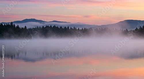 © ms25designs, Fototapeta premium Serene Misty Lake Sunrise: Tranquil Forest Silhouette, Pastel Sky Reflections.