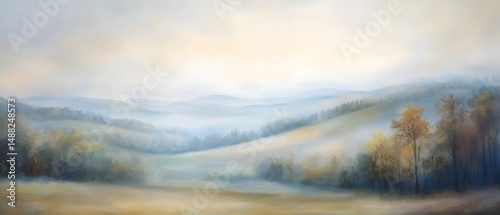 Fototapeta premium Serene Misty Landscape with Soft Hues and Gentle Rolling Hills