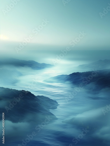 © Natali08, Naklejka premium Serene misty landscape with winding river at dawn.
