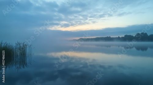 © PalaG, Fototapeta premium Serene Misty Morning by the Lake - Tranquil Atmosphere with Low Clouds and Foggy Sky Reflecting on Water Surface