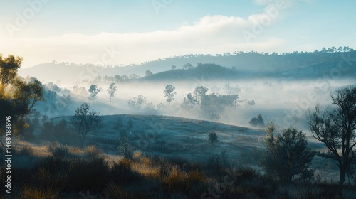 Fototapeta premium Serene Misty Morning Landscape with Rolling Hills and Trees