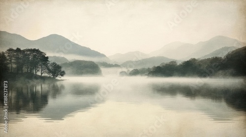 Fototapeta premium Serene Misty Mountain Lake Landscape Reflection