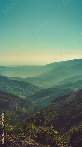 © Nibir, Obraz premium Serene Misty Mountain Landscape: Tranquil Green Hills, Vintage Tone, Summer Atmosphere