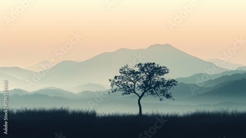 © Ismi, Fototapeta premium Serene Misty Mountain Landscape with Solitary Tree