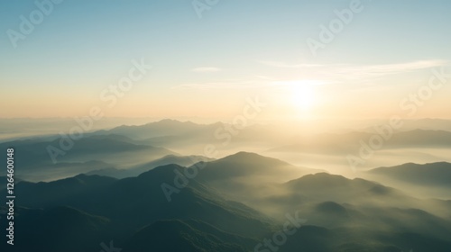 Fototapeta premium Serene misty mountains at sunrise with soft golden light, creating a peaceful...
