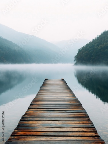 © Ryzhkov, Fototapeta premium Serene Misty Pier at Dawn Atmospheric Calm and Reflection on a South Korean Lake